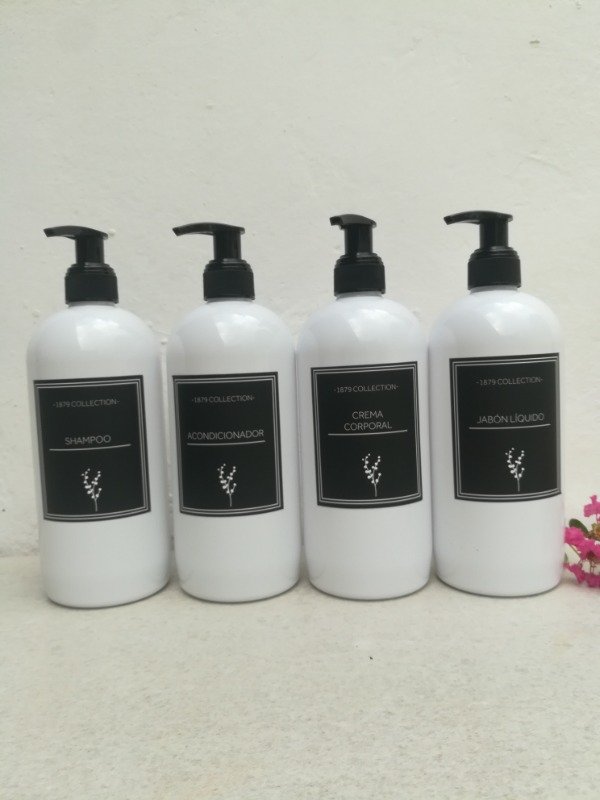 Set de dispenser plástico PET blanco con válvula cremera etiquetas resiste a liquidos
